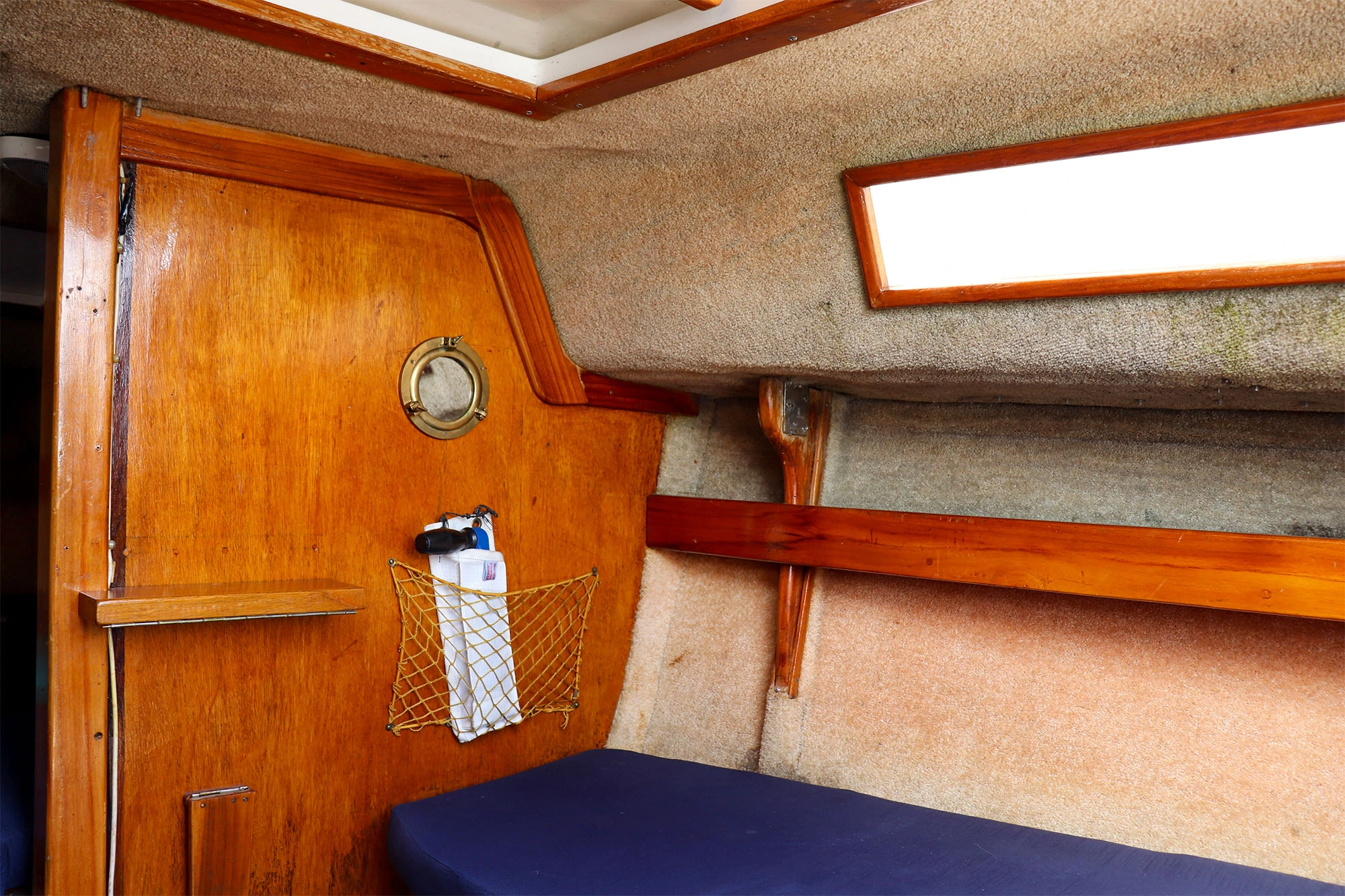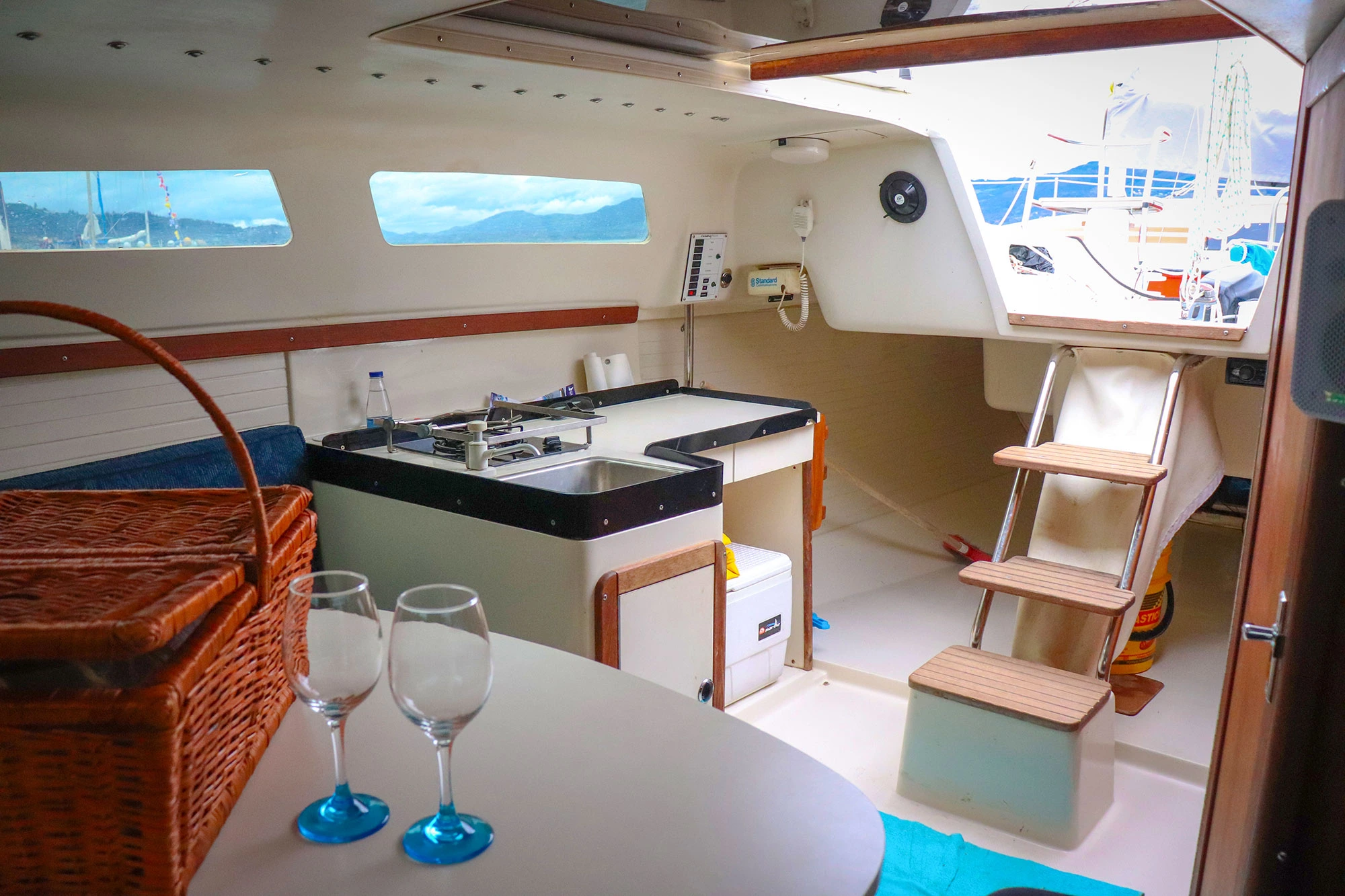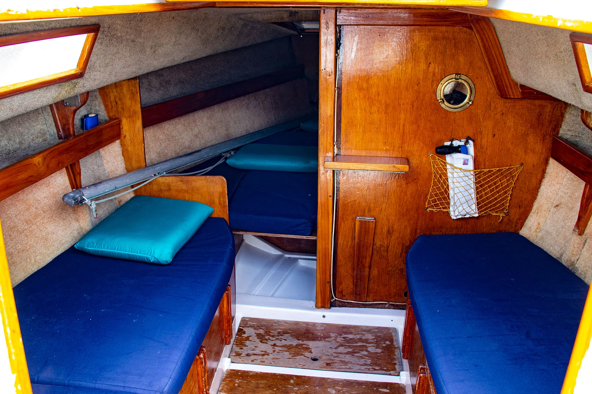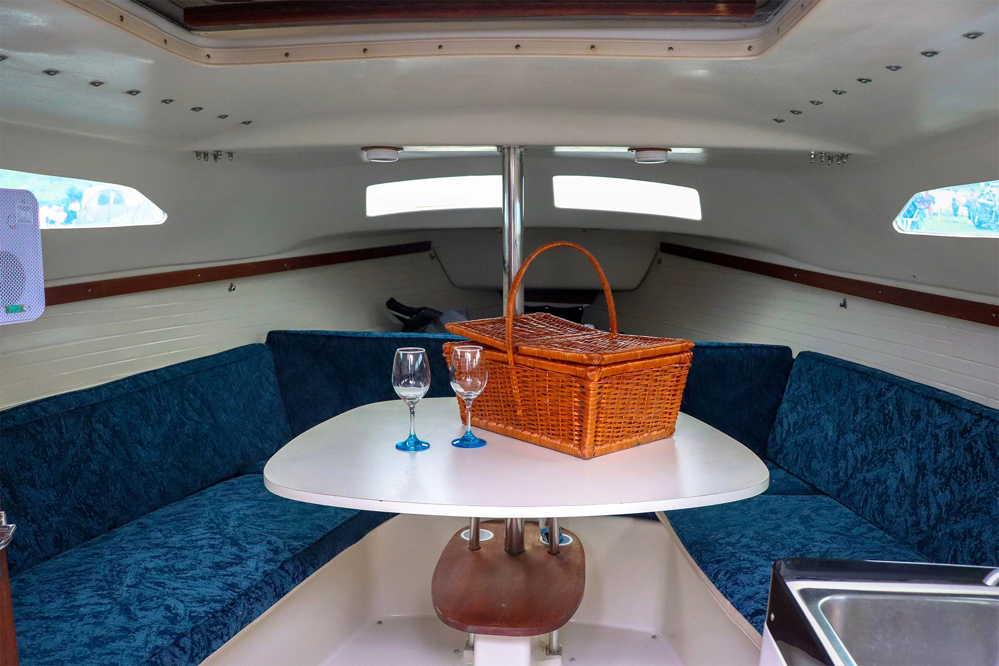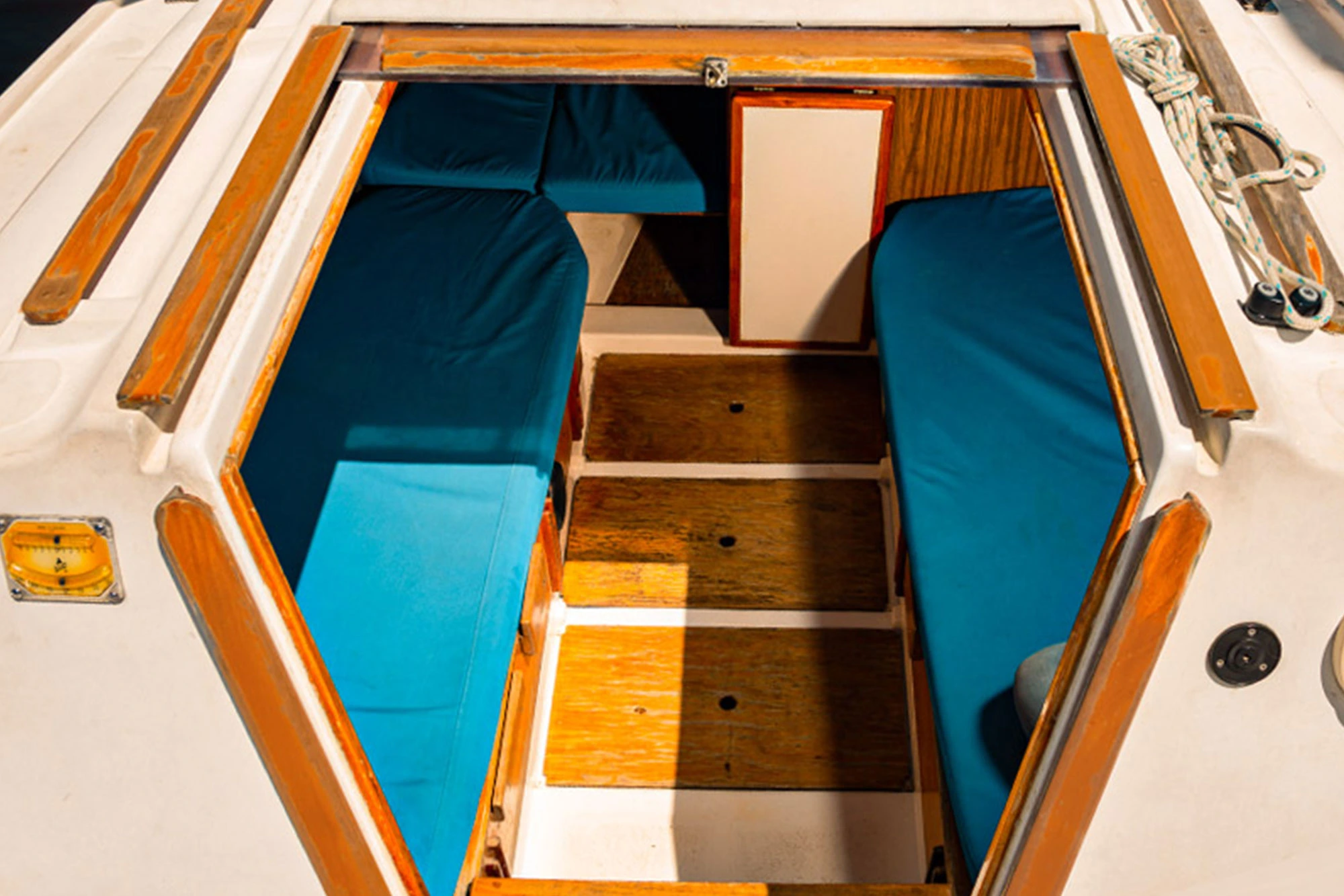 Embarcación color blanco con azul, tipo crucero, marca Catalina. Cuenta con cabina interna y acomodación tipo sala, pequeña zona de cocina, eslora de 25 pies, capacidad para 15 personas y motor auxiliar que permite mayor seguridad durante el recorrido.